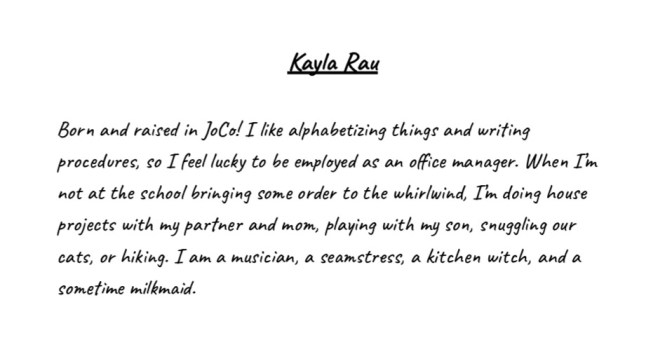 Kimiko spent two years as a Teacher Leader, working with Sara, Melissa, Ryan, and Kaci from 2020-2022. After the KCA proposal was accepted by the school board in September 2022, Kimiko transitioned to helping create a strong school board, serving as board chairperson, 2022-2023.